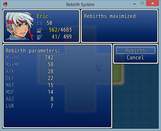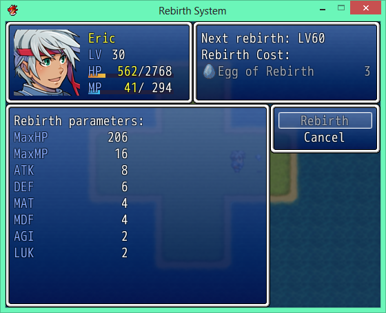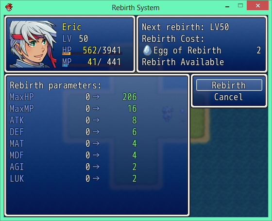 This script imitates the rebirth system similar to online games wherein you go back to a lower level, but granting you bonus parameters.