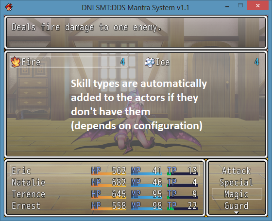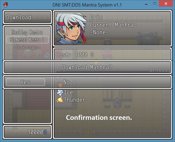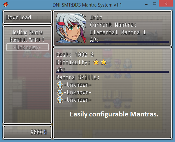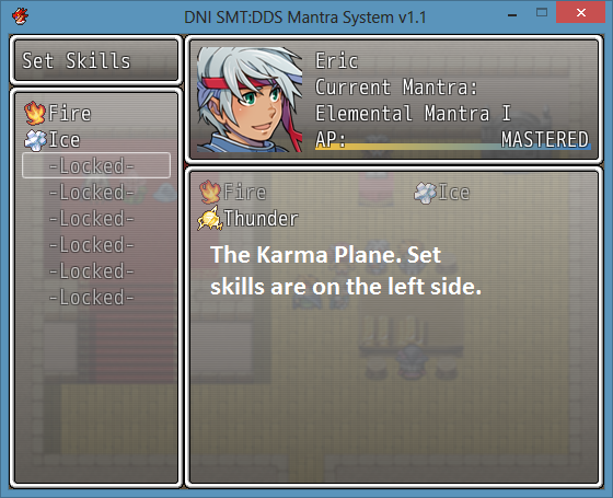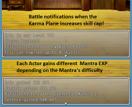 This script imitates the skill system from Shin Megami Tensei: Digital Devil Saga. Mantras are basically skill sets. Once mastered, you are able to use the Mantra’s skills. These skills then need to be set to the character (in SMT:DDS the chatacter’s set of skill slots is called the Karma Plane.)